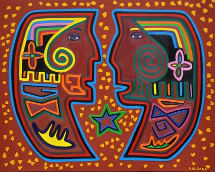 Otilia Saldana porta a Trieste l’eco di antichissime civiltà, i cui decori venivano realizzati attraverso elementi e pigmenti naturali, con i quali le donne indigene kuna usavano dipingere il proprio corpo, realizzando ancestrali esempi di body painting e che l’artista riprende nei suoi lavori in modo originale e autonomo rispetto al tema del folklore: simboli e segni che furono adoperati in seguito dalle indios kunas anche per decorare la camicia e il vestito di uso quotidiano, chiamati mola, e per abbellire le altre parti composite del loro abbigliamento mediante la sovrapposizione di strati di tessuto opportunamente ritagliati e cuciti a formare disegni complessi e nel contempo essenziali, in cui si riflette la luce e la vitale poesia dei Tropici.