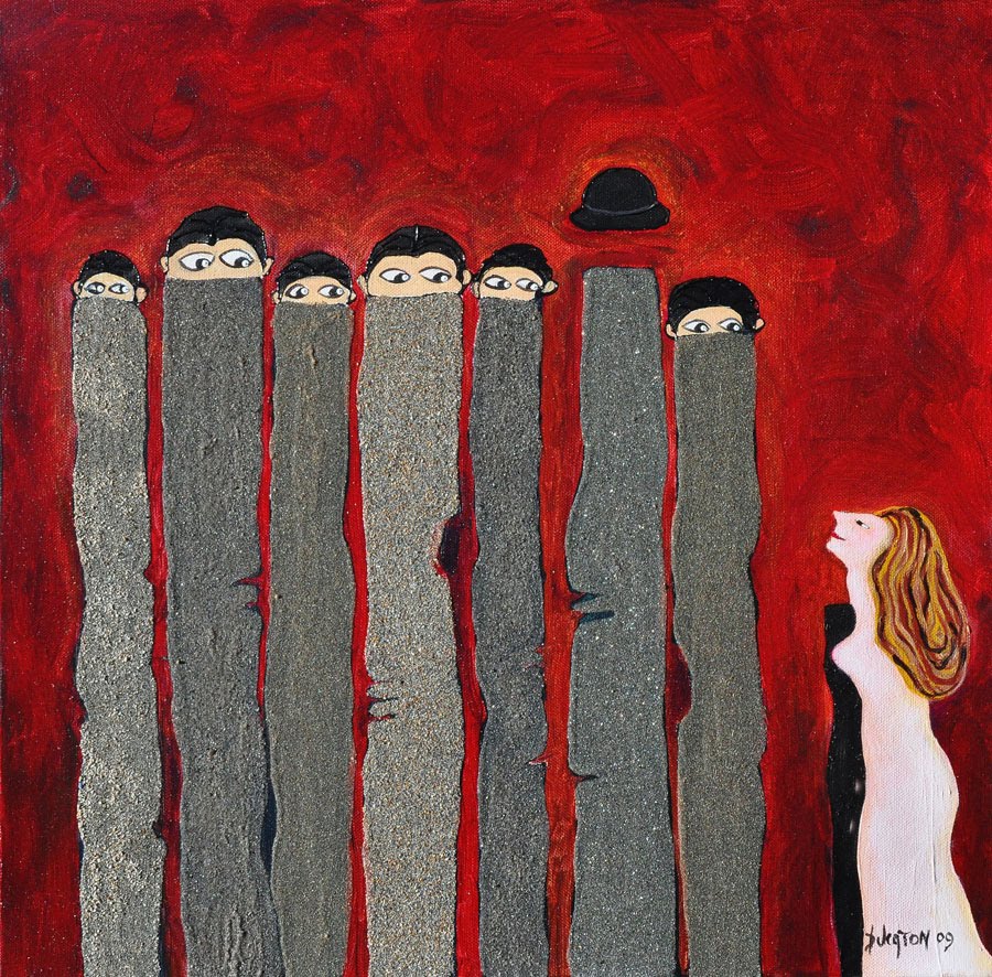 Le figure maschili o femminili, spesso stilizzate, sono congelate nel tempo e nello spazio imprigionate in una narrazione irreale… surreale. Nonostante la gamma cromatica sia brillante e vivace, l’atmosfera è carica di eccitazione come se i personaggi fossero in attesa di un’imminente calamità o, di contro, di un pieno appagamento.