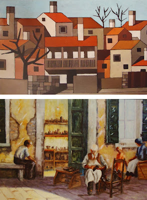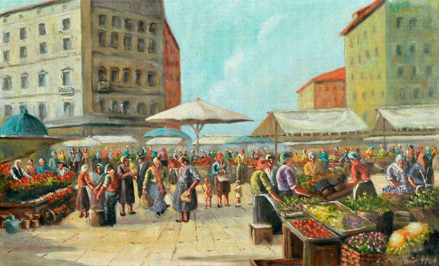 La medesima impostazione luministica e briosa, sostenuta da un ottimismo convinto, che potremmo definire quasi soave, ritorna nel paesaggio carsico e nell’effervescente rappresentazione della vita e delle architetture triestine: osservando il vivo contrappunto cromatico del mercato, sembra quasi di udire il vivace cicaleccio della gente e delle venderigole di oggi e di ieri. E così, il brusio dei clienti traspare nella rappresentazione di un antico caffè o il tono più rumoroso degli avventori nell’immagine di un’osteria, mentre poco più in là, sull’antico masegno che pavimentava (e ancor oggi in parte pavimenta) le strade di Trieste, scivolano le carrozze e par di cogliere il fruscio di lunghi abiti femminili.