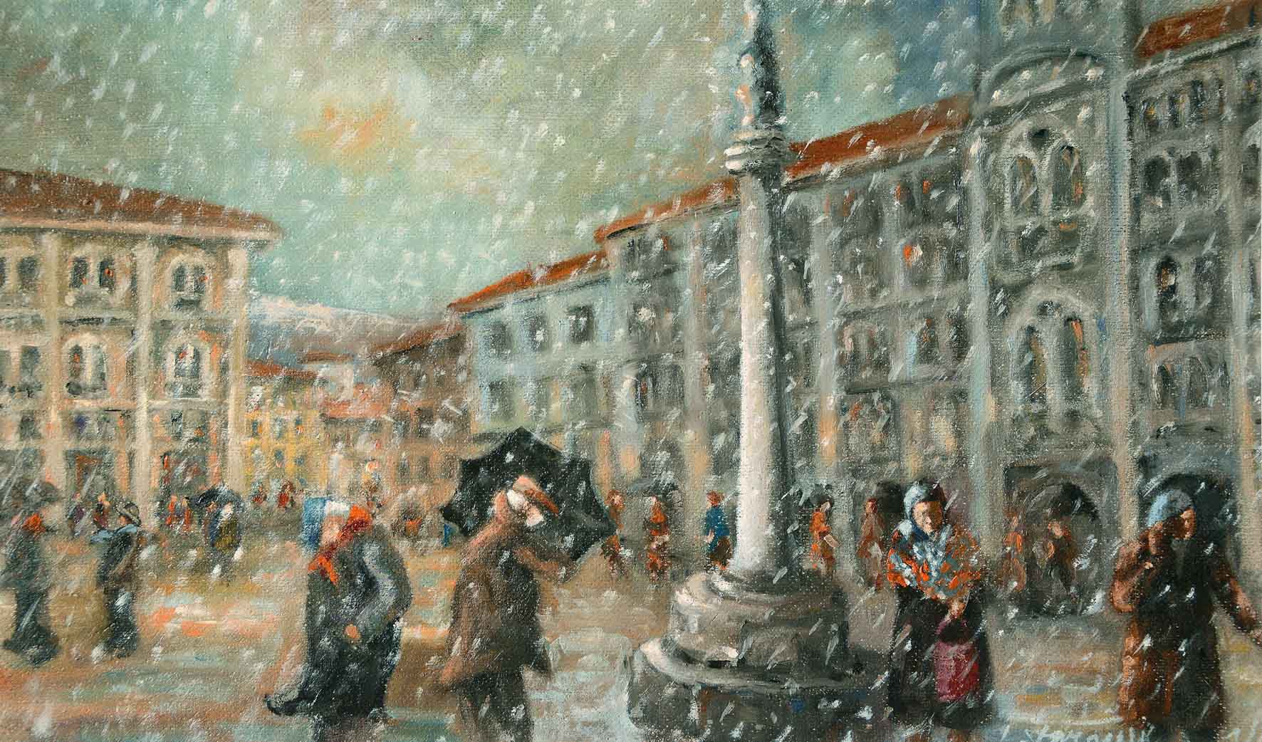 La luce con i suoi tagli inaspettati, i tramonti ora dolci ora tempestosi, la dolcezza di una nevicata su Trieste… sono colori che sgorgano dal cuore dell’artista, mitigati dall’esperienza di vita e da una nostalgia serena di quello che fu.